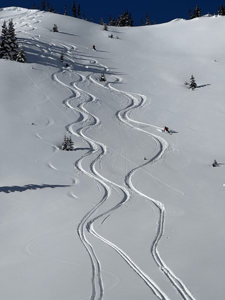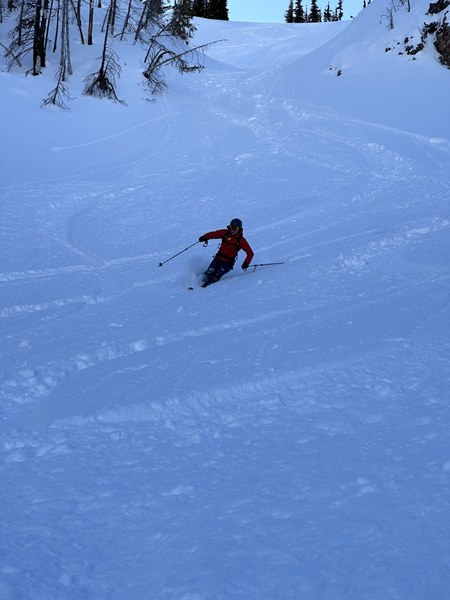 With a significant snowfall (~15") at Crystal on the preceding Wednesday plus a few inches on the day before (Friday), we expected N-facing aspects to still hold cold, soft snow, and they did indeed.