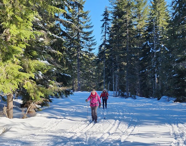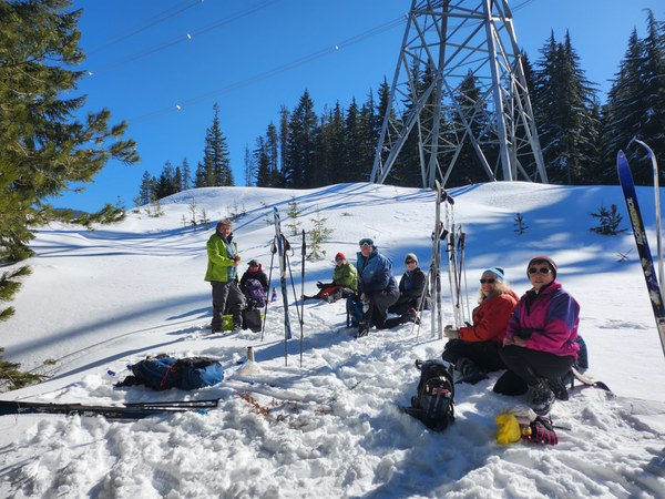 We had a chilly (+18F) start on a sunny day for an advanced beginner trip on easy terrain. Our party consisted of eight, a mix of recent Nordic ski course graduates, regulars, and some getting back into the sport after some time away. Mike Forsyth was the leader, on his first Mountaineers outing as primary leader, mentored by Karen Pyle. Mike led many trips with the Adirondack Mountain Club in upstate New York, but this was his PNW debut. We skied freshly groomed Forest Road 54, and passed by ungroomed Erling Stordahl hoping it would be groomed later. We got into the Sled Dogs trails, the Iron Mountain Cut-Off, and the Cascades to Palouse trail.