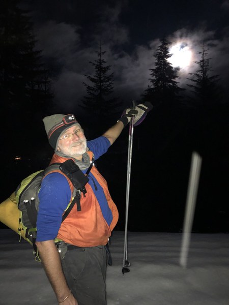 The weather prediction was for 20 inches of new snow would fall the night before the day of the trip. Most of the participants dropped out because of this weather prediction. The snow never materialized and the weather turned for the best for night skiing. Road to Snoqualmie Pass was clear, the clouds cleared up and the moon was shining above Keechelus lake.