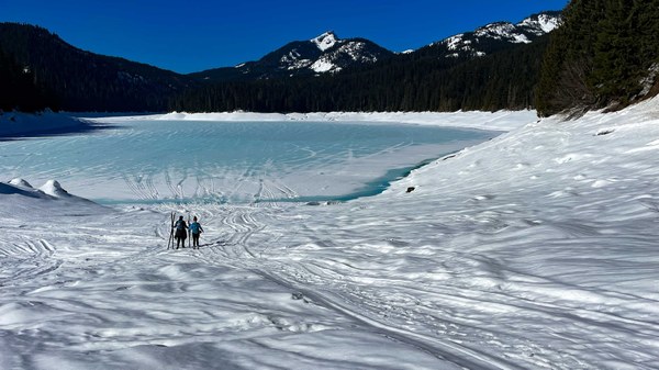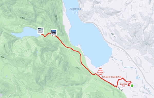 THE TRIP: We started out from parking lot #5 to the west, then around the dog sled loop, next onto the main ski/snowmobile area and then along the Paloose to Cascades section and dog sled sections. At the far end of Lake Keechelus (east) take a left beginning to head uphill on FS Road 5480 to Lost Lake.