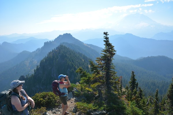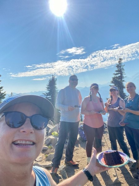 After what seemed like a quick hike along the switchbacks we arrived at the top of Bearhead. It was now time for celebration. This was the final hiking peak of the 15 hiking peaks on the Rainier 100 list for one of the participants. Since I knew this in advance I had prepared a sign for them to hold up for photo ops thinking that would be a neat thing. My assistant leader also knew this and not to be outdone had secretly transported an entire cake in their pack to the top along with plates and utensils! What a surprise this was for everyone.