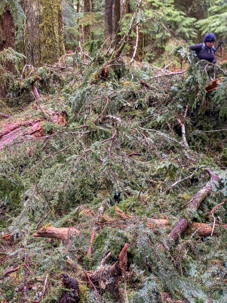 Several large trees are down on the trail; they were NOT an issue on November 23 on my last visit. Subsequent wind storms have caused more blow-downs.