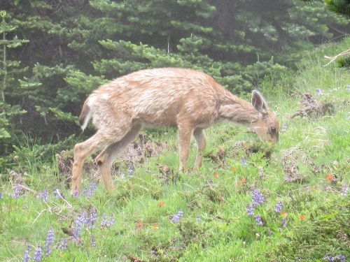 In the forest, rhodys are blooming. Candy stick and Pine sap are coming up. Great alpine flower show as we got closer to the top. Of course there were deer at Deer Park, we also saw Douglas squirrel and a Snowshoe hare. We continued to the top of Blue Mountain. Unfortunately for all our hard work, we were not rewarded with views. We were in a cloud.