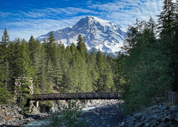 Tucked behind National Park Inn at Longmire, you actually drive through the employee housing and across a well-constructed suspension bridge suitable for vehicles to find the trailhead.