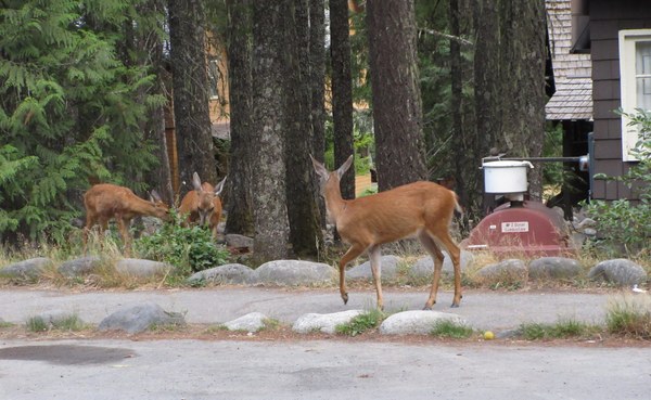Cool, comfortable weather greeted us on our 8:15 start from Longmire. A trio of deer wandered around the buildings enjoying their fresh greens breakfast: