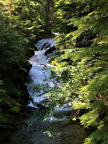 We did this trip as a downhill thru hike, staging one car at the Owyhigh Lakes TH off of Hwy 123 and a second car at Ohanapecosh. The hike was very pleasant and remarkably shady which helped combat the warm day. The solitude on the trip was excellent between our starting point and the intersection with the Grove of the Patriarchs. Not too many flowers (only saw one columbine blooming) but the focus of our trip was waterfalls and we saw A LOT of them!