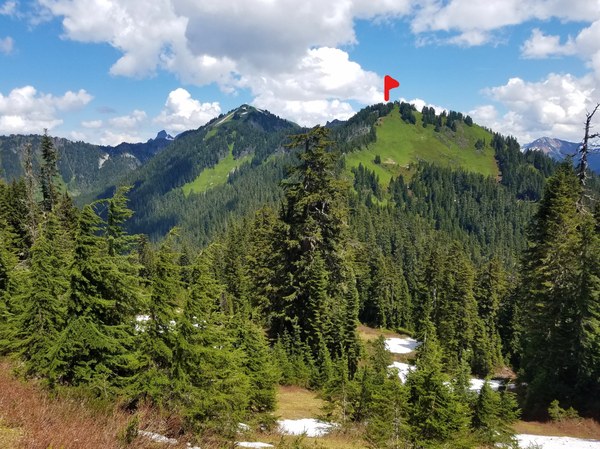 We're at the summit about a hour after leaving the knoll. Hardest part of the trip was this last mile. Lots of views from here too. Mt Baker behind the clouds.