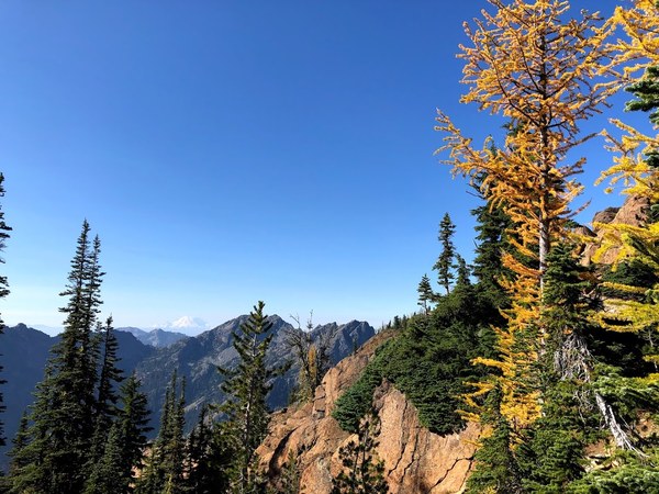 Mt. Rainier made an appearance beyond Esmeralda Peak and far in the distance Mt. Adams was visible. Two tall stately larches in full yellow greeted us as we approached the pass announcing we were crossing into the Alpine Lakes Wilderness.