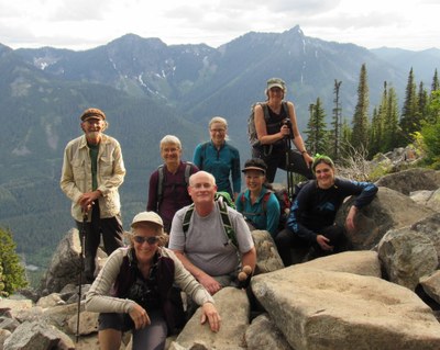 This was an after hours hike. Our goal was to be off the forest service road by dark and so we stopped at the Ira Spring Memorial for dinner with a view and did not descend to the lake. Not many flowers, but some bear grass in bloom. The trail is in good shape, the elevation gain was right for our preseason conditioning goals. We got a good workout with good company. There were more people on the trail than any other of our after hours hikes this season. The gnats were pretty bad, take insect repellent.