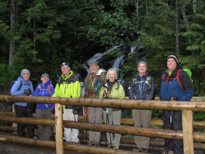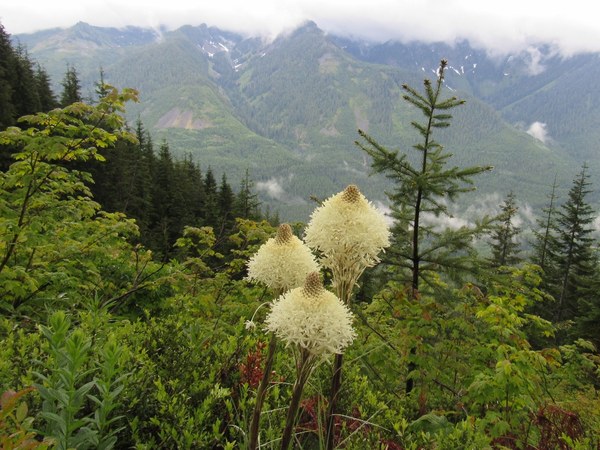 We enjoyed good camaraderie and good exercise, so I marked the trip as successful even though we did turn around short of the memorial. We had dinner just before the talus field, no sense crossing slippery rock when the view we wanted was obscure. Light rain turned to heavy as we left the trail. My main concern was that the weather meant it would get dark sooner than actual dusk and I wanted us off the forest service road before dark. The road is in good condition for a dirt road. Right now bear grass, columbine and bunch berry are blooming.
