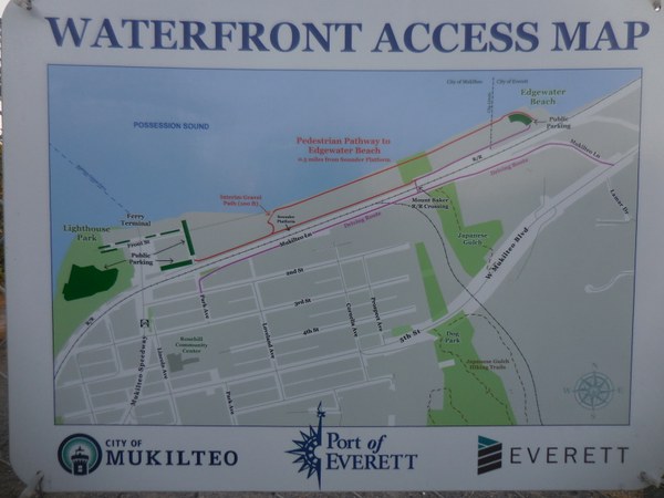 As we returned to the dog park, we continued north along the rail, went under Mukilteo Blvd, and discovered a railroad crossing for Amtrak/ BNSF railway with access to the beach and a city park. Short distance, level, and easy.