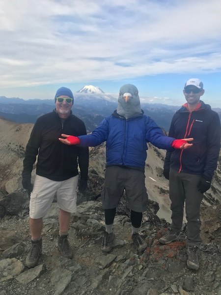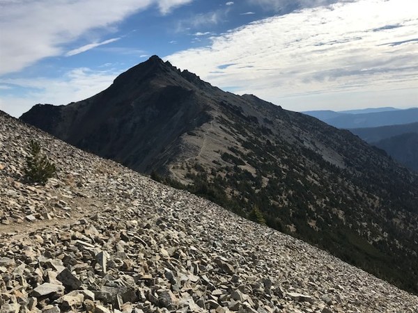 We snuck in one more day of mostly clear weather before the clouds and probably some snow arrived on this high summit. Highly recommended as a late summer or early fall hike when it is forecast to be clear and dry. Evan's eagle (pigeon?) eye caught the faint boot trail that leads directly up to the summit from the main trail, becoming more distinct as it goes. This direct route has minor scrambling and a little loose rock that should pose no difficulty to most hikers. The main trail traverses south for a while before doubling back to the summit. We took the main trail route down, which is recommended if you have time, as it allows varying perspectives of the vast views from this peak.