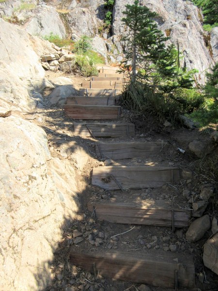 This had been a scheduled Mountaineers hike today, but my participants cancelled. Rather than let a gorgeous day pass, I did a solo trek via the Upper Big Creek Trail counter-clockwise and logged 13 miles rt with 5,000' el gain. It was a very nice trip, and I took several photos of the trail improvements done recently. The upper rocky stretch now has bolted log steps making it safer and easier to follow. Couple of examples: