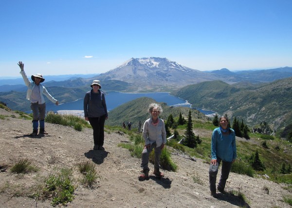 It was a beautiful day. The temps didn't get too high, but it seemed hotter as this is a very dry trail with little shade. The view of Mt. St. Helens and Spirit Lake just past Norway Pass is spectacular. The flowers are in full bloom on the lower trail right now and in early bloom higher up. As we hiked up, we had good views of Mt. Rainier, Mt. Adams and Mt. Hood. Mt. Jefferson was visible too. There were Elk and mountain goats. Bear Camp was a good resting spot and still has some water, once the snow melts, it will be dry. From Mt. Margaret, we could see into the crater. There were snow patches to cross on the way up - traction devices advised at this time.