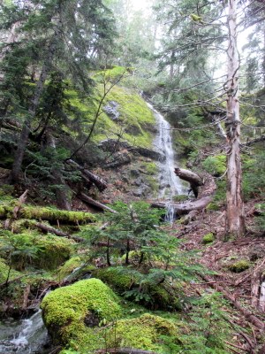 About eight small blowdowns below Horse Camp, easy to step over. Three big blowdowns on trail below summit, on the left 'steep' route, easily passed. Did the loop, a couple of large blowdowns along the ridge, but easily passed. Otherwise, trail is in good shape. A very large, unusual amount of water in streams, new waterfalls. Several small streams flowed over part of log bridge crossings. This did not present a problem, but caution needed on slick logs. Recommend waterproof boots.