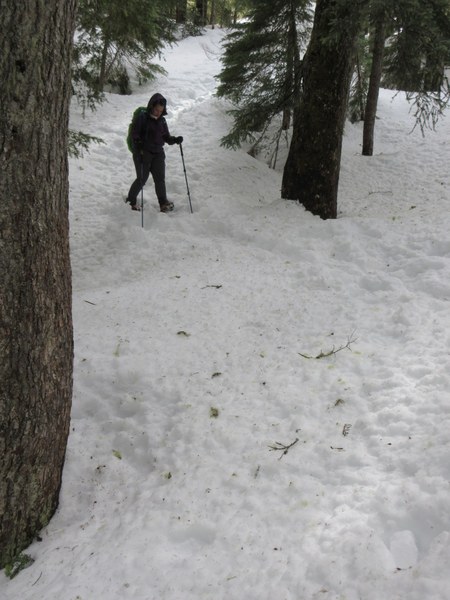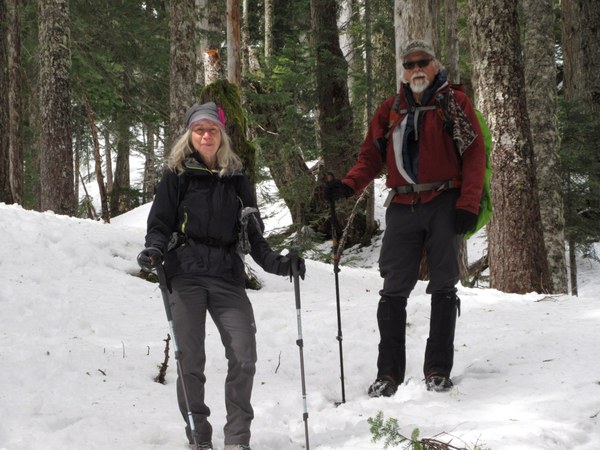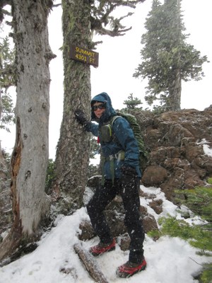 We started from the cars in partial sunshine, ended at the cars in partial sunshine, and experienced a mix of snow/wind/rain in between. A cold N/NW wind accompanied by horizontal snow hit us a couple hundred feet below the summit in the burn area. It was not a white out, and we all reached the summit. But we only stayed long enough for a couple of quick photos and passed on lunch. Descending the soft, slick snow was a bit tricky. By the time we got back into the trees the sun peaked out here and there with snow flurries that eventually turned to light drizzle and into partial sunshine at the cars. Turned out to be more adventurous than usual on Ol' Rosie!