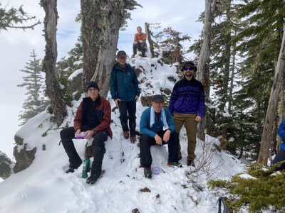 Excellent day with a strong group of climbers! The predicted rain never materialized, but a low cloud cover obscured views. Temps warmed into the high 40's and we were met with some snow bombs on our descent. A few other parties of mostly two, but otherwise we had the trail to ourselves