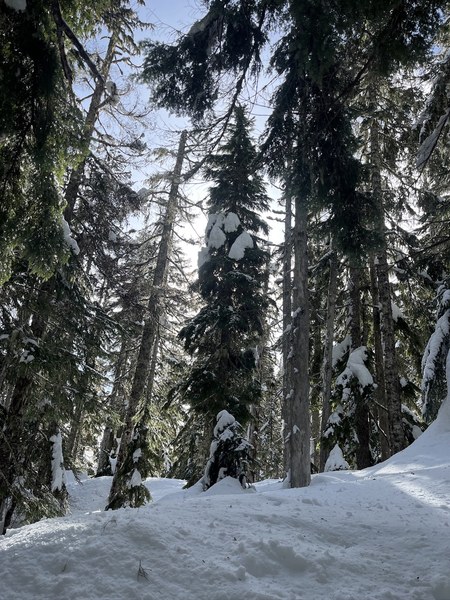 Our large group of nine all made the summit in just under 3 hours. This included only a few short breaks, transitions, and gear adjustements. At the summit we had to carefully guard our snacks from bold opertunistic birds perched on the snowy trees above.