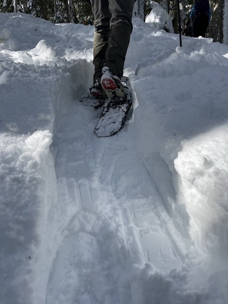 After spending about 30 minutes on the summit we carefully made our way down the steep slippery snow on snowshoes. By 11am the snow was getting wet and slippery making the descent on steep snow a bit of challenge. Once we got down off the steep section we coasted back passing many other hikers on the descent.