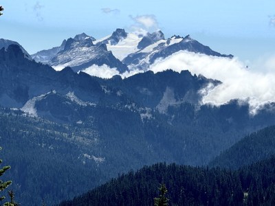 After availing ourselves of the privy at the Skykomish Ranger Station we drove some 7 miles up an unusually smooth, unpaved Forest Service road to the Tonga Ridge Trailhead. There was already one car in the parking area. We met only a handful of other parties in the course of our weekday trip. We hiked about 2 miles to where the obvious side trail to Mount Sawyer goes off, marked by a cairn. Progress slowed as we entered the meadow slopes below the summit, filled with blueberries. The summit rocks offered excellent bang (views) for the buck (effort). Scattered clouds offered changing views with Mt. Daniel (attached photo) and Mt. Hinman dominating the south, while Stuart and the Cradle could be seen to the east, Jim Hill to the north, Chimney Rock to the southwest and Gold Eagle and Silver Eagle in the immediate vicinity. We encountered a woman participating in a census of hawks and falcons. Descending back to the main trail we followed it to the intersection with the trail to Fisher Lake. Finding the blueberry offerings below expectations we had a snack, then returned to trailhead. We gained 1,180’ in 7.5 miles of travel over a little over 6 hours.
