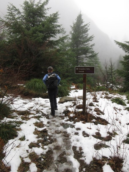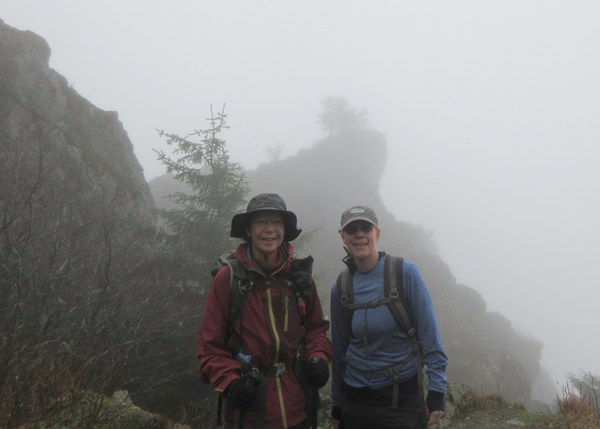 Light drizzle in the parking lot both in the morning and upon our return. But very little rain most of the way up. We got wet mainly from tree drips. The sun actually peeked out a couple of times! All sections of trail were in good shape, no down trees to step over. Small patches of mushy snow at the pinnacle, no spikes needed. A cold wind hit us above 3,000' but we found protected lunch areas around the pinnacle base. Nice close-up views of clouds. As usual, a lot more hikers were on the regular trail than on the Old Trail. 5 hours/22 minutes round trip, including brief stops and lunch break. All things considered, a good day out!