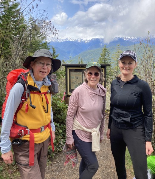 A great day with hardly any rain, just a few spits here and there! We didn't even need rain gear. Most of us did two rounds since the second was optional. We met a few other parties of two or three plus pups on the way up and down. The clouds parted and surprised us on both our summits with sun and views of the Olympics! Lesson learned: it's often worth going in spite of the weather forecast because the mountains may make their own weather!
