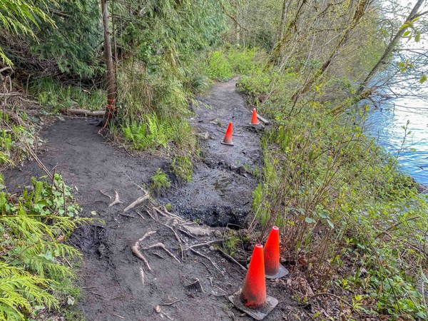 The trail is muddy in places, particularly along the waterfront where some cones mark off eroded areas being restored. There weren't many people on the trails, but several school groups were using the playfields and playground.