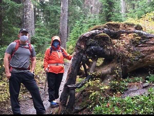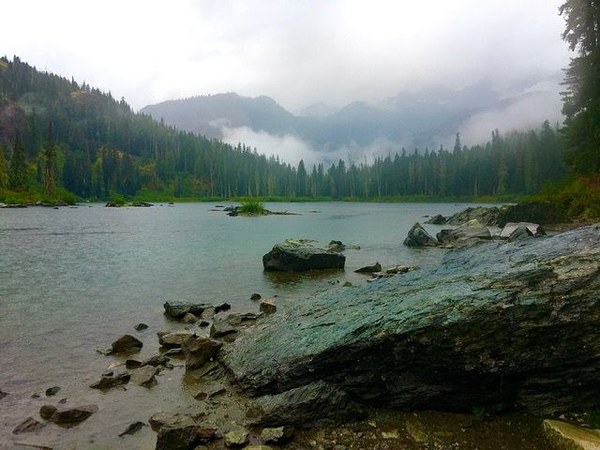 Don't let the rain get you down! After filling out our Alpine Lakes Wilderness day permit, our group headed out on the Pete Lake trail in late September on a midweek rainy day. There were a few cars parked in the parking lot when we arrived, but with the exception of one person (in hunting garb), we didn't see another soul the entire trip, so had lovely solitude for our hike. The trail was lined with small needles from Western Hemlock trees, but with the rain during the day, some pretty large puddles and rivulets developed, which ran down the middle of the trail. This allowed us the opportunity to exercise our inner thigh muscles as we jumped laterally from one side of the trail to the other over the water in between.