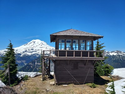 We had a leisurely lunch at the lookout tower enjoying the perfectly clear views of Mt. Rainier from the Shriner lookout tower. We also had views of Mt. Adams, Mt. Hood, Mt. St. Helens, Old Snowy, Double Peak, Cowlitz Chimneys, and Bald Rock.