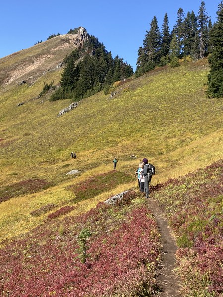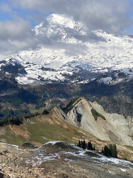 We started hiking at 8 a.m. under a clear sky. It was chilly enough to need a puffy or jacket at first, but we quickly warmed up. The trail starts fairly steep through a forest that has some nice old growth trees. It does level off now and then, and eventually goes down and up and down and up. The surface has a nice variation of dirt, roots, rocks, narrow, wide. After leaving the main forest, most of the trail traverses steep slopes covered in grass and other dry growth that are probably gorgeous wildflower meadows in early summer. The only wildflowers I spotted were Pearly Everlastings - an apt name! Shaded areas were covered with a light frost that was gone in the afternoon on our descent. The summit had small patches of thin snow that were not a problem. We hiked a little over 11 miles rt with 3,600' gain in 9 hours, including leisurely breaks.