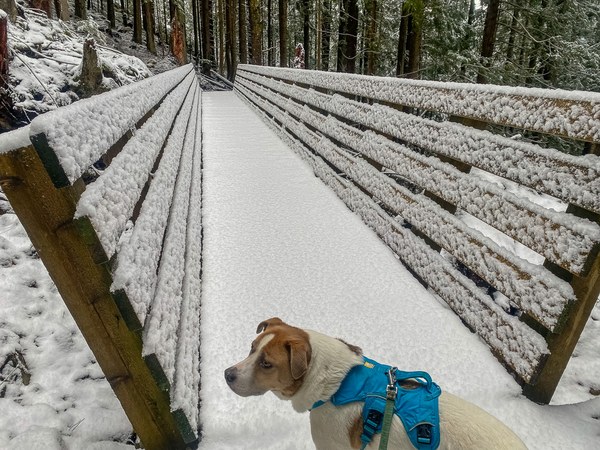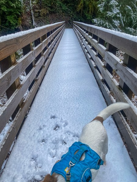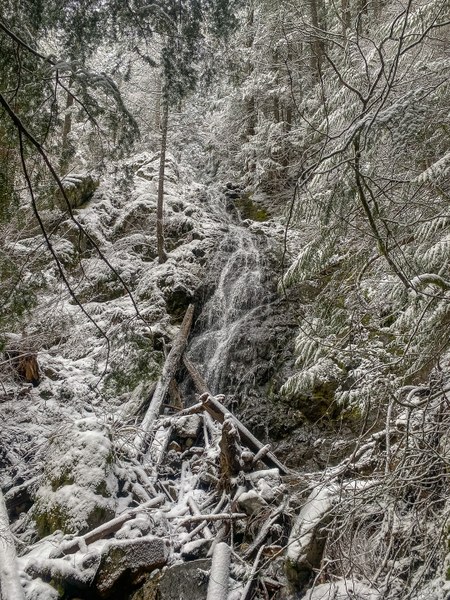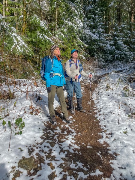 We had a beautiful morning on Roaring Creek / Teneriffe Connector / Talus Loop and Teneriffe Falls trail segments, with a dozen bird species and 2 inches of fresh snow. Many thanks to my two hiking partners and Ajax for making some magical memories on a hike that almost got canceled!