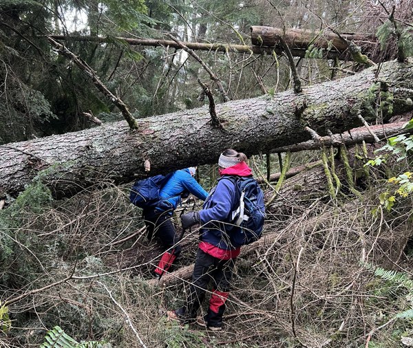 West Tiger 3: The descent via West Tiger 3 presented a stark contrast to the ascent, especially the upper half. This trail, which faces north, didn’t fare as well in the storm’s southeast winds. The blowdown was significant, especially on the upper third, with multiple large trees partially obstructing the trail at various points. The trees, blown down from the southeast, were scattered across the trail, many landing to the northwest, creating a maze of obstacles that required careful navigation.
