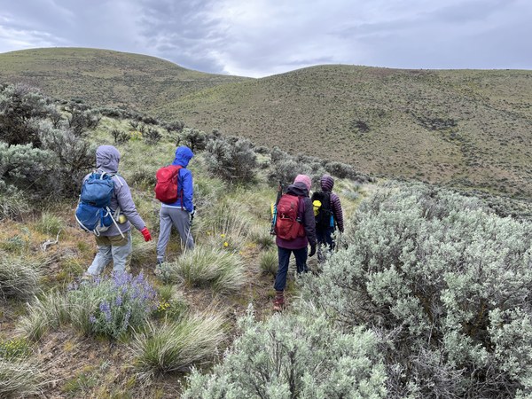 We followed the former off-road path (now being reclaimed by plants) that runs to the northwest and eventually meets with Whiskey Dick Corral Rd. We did not follow it that far, but stayed on the trail for 1.9 miles as it transitioned from grassland and flowers to sagebrush and flowers and then reached the bottom of a gully. Then we went off trail and uphill to the northeast until we intersected with Whiskey Dick Ridge Road. When traveling off-trail--which is allowed in this wilderness area--we made sure to spread out and now walk single file to minimize the impact on the land. This road is open to off-road vehicles, and we did see one in the distance, but it must have turned around because it never reached us. We went east for 0.5 miles until we were just below the highest point in the area, and went off-road the last 0.1 miles to reach the rocky peak. Fortunately, the rocks provided some much-needed shelter from the wind, and were a good place to rest and have a snack and soak in the views. We backtracked until we reached the bottom of the gully I mentioned earlier, and then followed it east for about a mile, then crossed to the other side and intersected with an old off-road track that is being reclaimed (no off-road vehicles allowed). We followed this road the rest of the way back to the trailhead. Our group did not see anyone else on trail all day.
