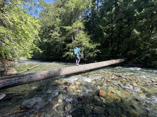 We started our adventure at the Canyon Creek trailhead. The advantage of this trailhead over the East Bank trailhead is that you avoid a 3+ mile creekside hike parallel to Hwy 20. The downside is that the bridge is out and Ruby Creek can be almost-knee-deep and pretty fast. Luckily, we spotted a log approx 100 yards upstream. It took some work to get to, but it nicely spanned the river: