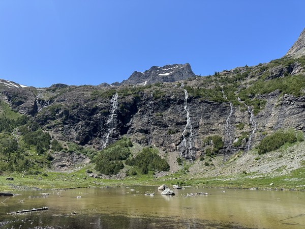 The log was our last flat stretch for a while... for 5 miles and 3900' of gain, to be precise. With very few views. But after that effort, we found ourselves at gorgeous Crater Lake, with Crater Mountain towering above us and multiple waterfalls cascading before us:
