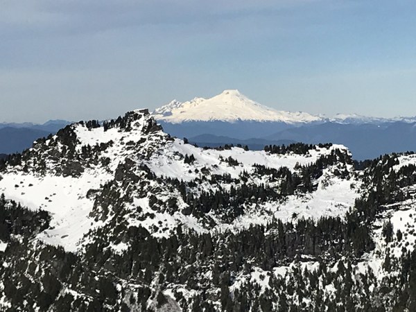 Snow-free and obstacle-free standard Cascades dirt trail for about 2 to 2.5 miles; after a small gully with a trickling stream (a feature which is one of this trail's winter hazards) patches of snow and ice began to appear. In the morning chill the snow and ice was slick at times. Pretty quickly the trail became consistently and completely snow-covered and we donned our microspikes. For the last 1.5 miles or so up to the summit the trail was blanketed with snow but easy to follow as there was a well-beaten path. Microspikes and poles were very useful - my alpine gaiters were overkill though, except for when I strayed off the beaten path to stomp around for fun in the open snowy spaces near the summit.