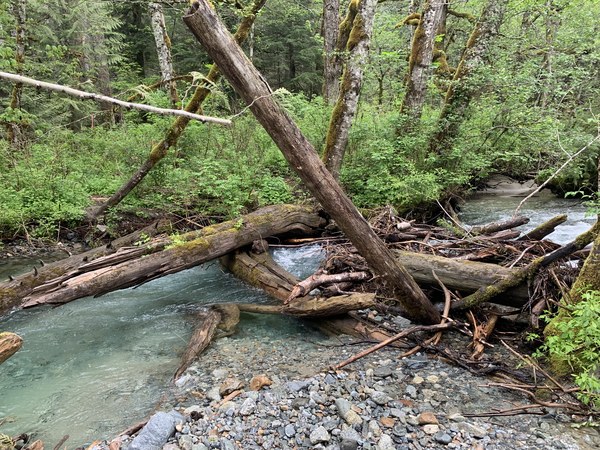 We started climbing at 11:30 AM. From the parking lot, we traveled west down the road about 400ft before turning right into a faint trail to where a group in the parking lot had scouted a downed tree that provided an optimal creek crossing at 48.49362, -121.12365. We were able to keep our feet dry for all of the creek crossing, leaving our water shoes in the car.
