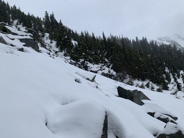 We bushwacked through the first forested section of the climb, weaving over and under downed trees, reaching the boulder field around 1:10 PM at 48.50344, -121.11949 at just over 4000ft. Staying climbers right on the boulder field enabled periodically avoiding some boulder sections by taking a small trail. The rocks were not too slick, but we were glad to have opted not to bring trail runners, which would not have had sufficient grip. Around 4900ft, the boulders were covered in about an inch of snow, slowing our pace.