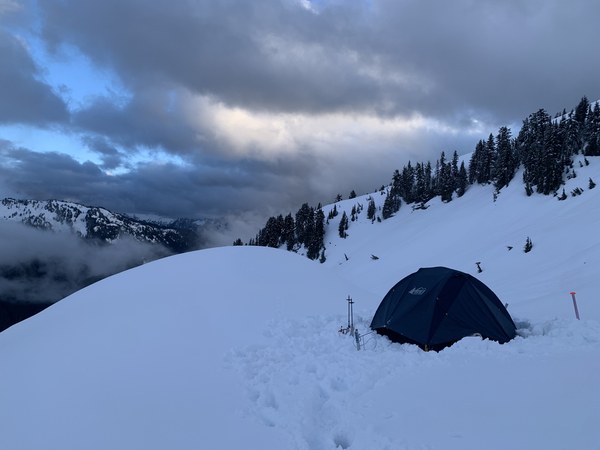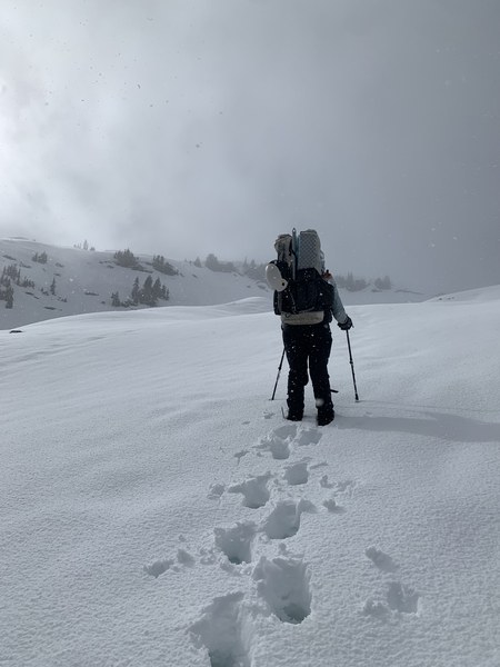 After over 3 hours in the boulder field, we knew we were no longer going to make our original goal of camping in Roush Basin. We climbed (and postholed) through the soft snow until visibility started to decrease, so we decided to stop and set up camp around 5,700ft at 6:15 PM.