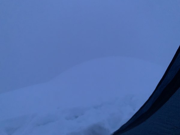 We set our alarms for 4AM, prepared for a long hard day in the deep snow and hoping for firmer conditions in the morning; however, we awoke to whiteout conditions.