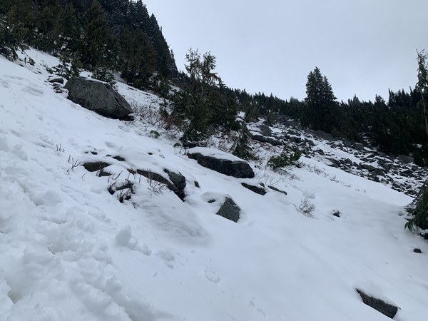 Bring floatation for traveling on the soft snowpack and be prepared for no bootpack. River crossing was straight forward with a log crossing. Upper section of the boulder field is covered in a layer of snow making it harder to navigate safely.