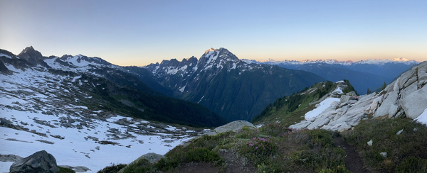 Trail climbs steadily through trees and boulders from 3950' to 5080', through a few patches of snow before crossing over the ridge at 6130' (48.51611, -121.12053). Beautiful views all around.