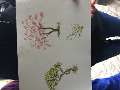 Water color sketching in the Arboretum with 17 sketchers and leaders in a drizzling rain with light wind. We learned from each other and enjoyed a profusion of greens from new leaves and grasses.