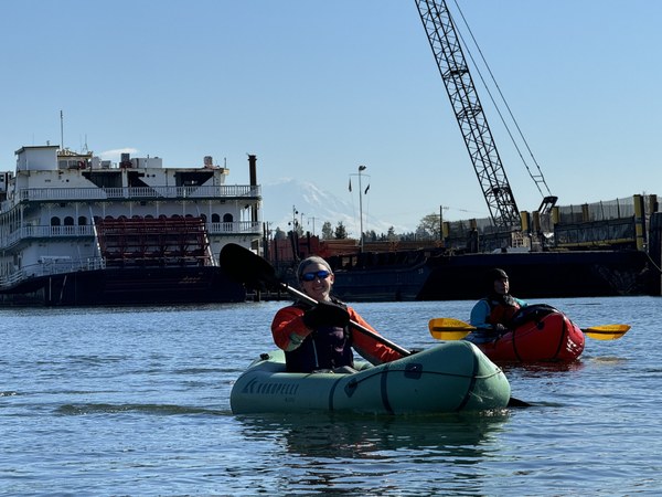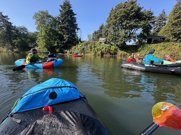 Eight packrafters enjoyed a paddle down the Duwamish River on a sunny October day. Because this was an experience paddle for the Flatwater Packrafting Course, to allow time to practice rescues and paddling strokes, we ran the 7 river miles from Codiga Park to he?apus Village Park; a longer (13-mile) trip could start at Fort Dent Park and take out at Jack Block Park. The ~450 ft carry to the river from parking at Codiga is a pleasant walk through the woods carrying packrafts, but sea kayakers may find it a little long.