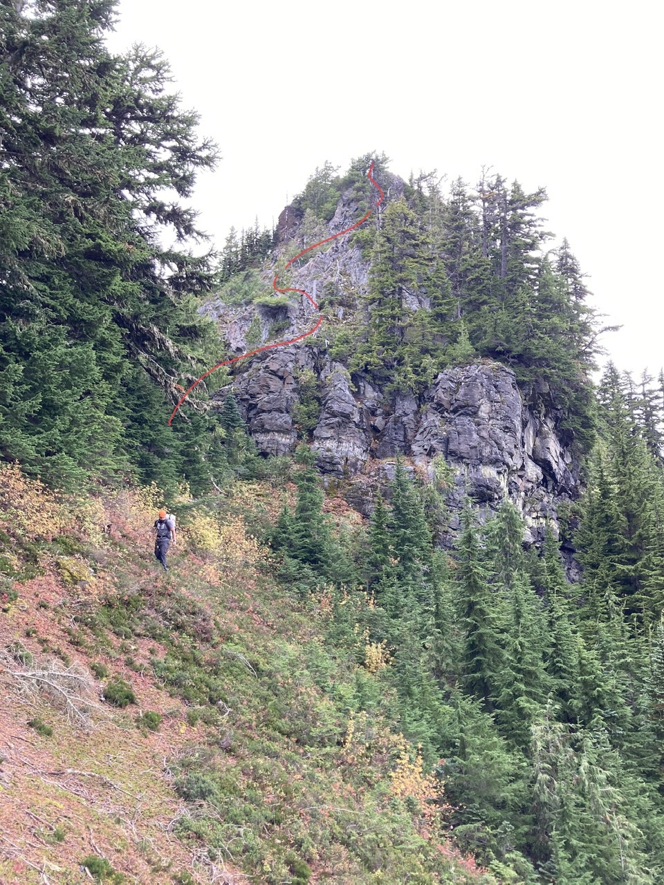 We negotiated this cliffy section with a game trail on ascender’s left (outlined in red) that led to a steep/tricky T4 section. Past this section it was an easy traverse to the upper summit of Gove.