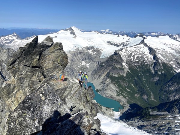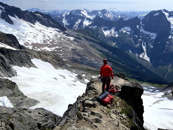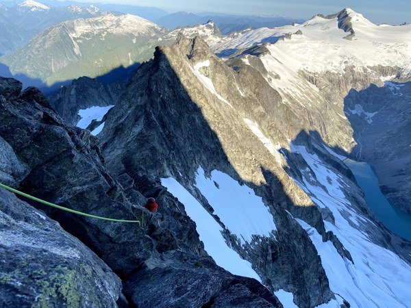 At that point there were 2 parties coming up the North Ridge and one from the East Ridge. It seems like the harder routes were getting more popular than the 'easy' route at this point. We were the first the start heading down to try to not take up too much time. Another party was coming up as we were all descending, so that must have been a wait for them. From the false summit we made three rappels on the ridge itself with some simul-downclimbing in between, passing another group headed up the West Ridge. The rappel stations were all white/black static cord that made for 'straightforward' rappels, even though the raps were all at awkward angles. Saddlebags are a must on this route. In a moment of vacuous stupidity I dropped my ATC device and had to have someone tie it in to haul it up the rope for me to go down. Definitely bringing carabiners for c-b rappelling next time.
