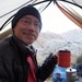 The toe of the Colonial Glacier is in a large bowl, hidden behind a ridge that comes down the northwest side of Colonial Peak. That same ridgeline contains several great campsites. At this time of year, the lake was frozen and seemed to have large chunks of ice within it. There was a tarn of recent snowmelt on that ridge as well, so we didn't have to go down to the "lake" to get water. Reached camp at 3:45 pm. 8 hours from trailhead. (Photo shows camp with small tarn. The glacial lake is down to the left.)