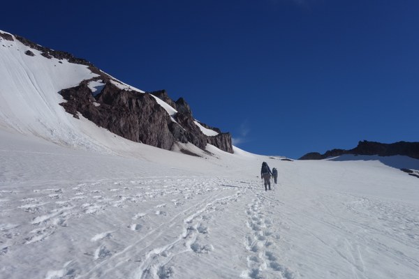 Despite the early hour of the day, the rock face below Disappointment Peak was already breaking off so we moved as quickly as possible below that section and our track was safely below the rocks we saw falling out. This is an area where any delay should be avoided and a wide berth path is necessary. We continued up the Gerdine glacier to a sharp left bend where it merges with the Cool glacier. There are two small crevasses opening at that bend where the two glaciers meet but they can be easily avoided.