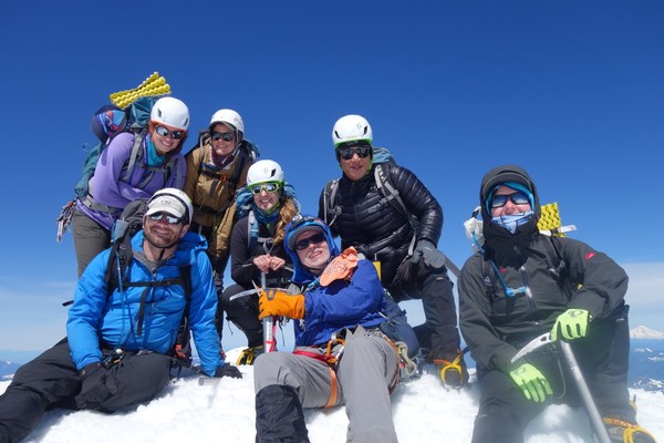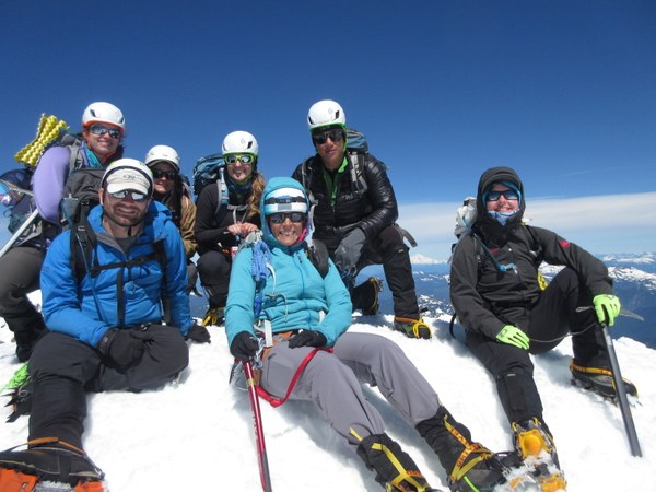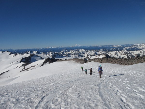 From here a climber’s trail took us up the scree ridge below the summit block. At the end of ridge at 10,000 feet, we stepped off the rocks back on snow and climbed steeply well-defined steps for the last 500 feet to the summit that we reached at 10:45 AM. It was a bluebird day with incredible views in all directions. We could see the all the way to Adams to the South, as far as the Olympics to the West, and Baker, Shuksan and all the North Cascades to the North! It was the first volcano for one of participants and a first glacier climb for another and the first Glacier Peak for all but the two co-leaders. Everyone was elated to have accomplished this summit.