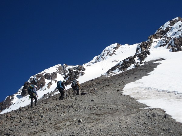 After 30 min at the summit to take many pictures, we re-traced our path back to the saddle where we had lunch in the sun. We then roped up again and stayed roped up until after the bend and then descended un-roped until the Gerdine Ridge. Students kept crampons on until then, but snow had softened a lot b